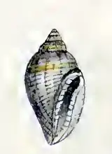 The small shell is remarkable for its oval subglobulous shape, with a convex very short spire, briefly acuminate The coloring is of a bright hyaline white, embellished with a very narrow yellow band, situated a little above the lower suture. The spire has a crystalline aspect. It is rather strongly thickened, very finely striated throughout its length, adorned with longitudinal ribs. These are flexuous, low, numerous, and form, at their enlarged base. continuous concentric arcs . Small, decurrent, regular, numerous lirae, traverse the whorls and surmount the ribs and undulate in their interstices over the entire surface. The shell contains 6 to 7 (?) whorls (the fractured top in the received specimen shows only 5½ whorls). The first two whorls are rounded. The rest are convex, separated by a linear, undulating, somewhat thickened suture. The body whorl which exceeds 2/3 of the total height, is globular in its upper part, attenuating slightly below its middle to end with an elongation in a very short siphonal canal. The aperture is oblique, narrow and has a continuous peristome. The columella, concave in its upper part, is coated with an enamel whose edge rises in a blunt crest. Starting at this ridge, pointing inwards, are 8 folds regularly spaced along the length. The outer lip is convex, strongly thickened; Its sharp edge is not prominent. The folds in the interior protrude in the form of strong denticles. The almost round sinus is dug a little below the suture in the callosity of the outer lip.[2]