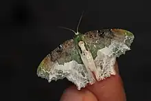 The inner area of the wings is greenish, whereas the outer area is whitish. A conspicuous submarginal black spot is found centrally in the ventral side. The caterpillar is olive green with brown speckles. Anterior and posterior segments pale purplish brown. A double brown line is found dorsally. Pupa greenish with minute purplish-brown speckles. The host plant of the caterpillar is Loranthus.[3]