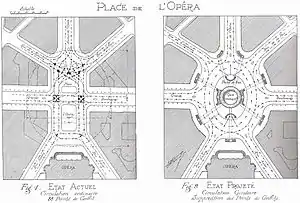 For the Place de l'Opéra he added aesthetic considerations to concerns over the problem of motor traffic and motoring, regretting that it was impossible to see the main facade of the Opera building as a whole.[50] He, therefore, proposed to double the width of the square and give it an almost circular form, slightly oval: the oval would be 120 by 136 metres (394 by 446 ft). This eccentricity would be small enough not to slow down the circular movement by bends with too narrow a radius. In the middle of the square, a large circular funnel 20 metres (66 ft) in diameter would provide light and air to radiating underground pedestrian galleries and the Metropolitan station. Access to the underground passages and the station would be via two central stairs and seven stairs around the perimeter.[50]