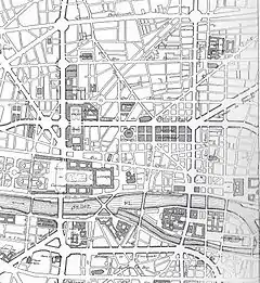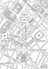 Anticipating growing volumes of traffic, Hénard was in favor of a network of ring roads around the city center linked by arterial roads crossing the city.[42] He presented a project for a nouvelle grande-croisée Est-Ouest de Paris ("new major east-west crossing of Paris") in 1904.[43] In his plan, two broad avenues would intersect at right-angles at the Palais-Royal, dividing Paris into four districts.[44] They would join in a roundabout, cutting into the west side of the Palais-Royal.[25]