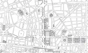 The east-west artery, the new Avenue du Palais-Royal, would run along the route of the Rue Rambuteau, which would be expanded, through the Palais-Royal and into the Avenue de l'Opéra.[45] The avenue would pass through arches cut through the wings of the Palais Royal similar to the arches in Hector Lefuel's wing of the Louvre.[46] The avenue du Palais-Royal would be 35 metres (115 ft) wide. It would intersect the north-south Rue de Richelieu, enlarged to 40 metres (130 ft) in width and renamed the Avenue de Richelieu. Both avenues would be extended to the gates of Paris and would make the best possible use of existing roads. [46][lower-alpha 2]