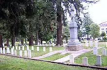 The "signature" of the Eugene Pioneer Cemetery is the Grand Army of the Republic burial plot located near the center of the cemetery. The plot was purchased in 1887 by the Gen. John W. Geary post of the Eugene G.A.R. There are fifty-seven known graves in the plot including fifty-one Civil War veterans and six women and children. In the center of the plot stands a twenty-five-foot statue of a Union soldier. In 1903, Union veteran John Covell's estate, valued at $2,500, specified that a monument be placed at the G.A.R. plot where he was laid to rest. The bequest was challenged in court by Covell's relatives, but a Eugene judge ruled in favor of the G.A.R. The statue was carved in Vermont and shipped by rail to Eugene. The 8-short-ton (7 t) statue was brought to the cemetery by an eight horse team and raised by block and tackle. In December 2001, vandals broke the head of the statue off and pulverized it. Local artist David Miller was commissioned to sculpt a replacement. An 800-pound block of blue marble was obtained from the same Vermont quarry where the original statue was carved one hundred years before. The new head was installed in February 2003 and dedicated that Memorial Day.