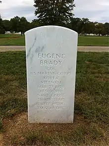 Eugene R. Brady (1928-2011) was a United States Marine Corps officer and naval aviator who was the recipient of the Navy Cross and a later Silver Star for his heroic actions during two separate medevac missions taking wounded Marines from a landing zone while under fire during the Vietnam War. At the time of these awards, he was serving as the commanding officer of HMM-364, The Purple Foxes. He began his career as a fixed wing pilot and saw service in the Korean War with VMF-311. He did not transition to flying helicopters until 1968. During the course of his career he commanded four different squadrons, Marine Corps Air Station Tustin and Marine Aircraft Group 16.[1] Colonel Brady retired from the Marine Corps in 1980 after more than 34 years of service.[1]