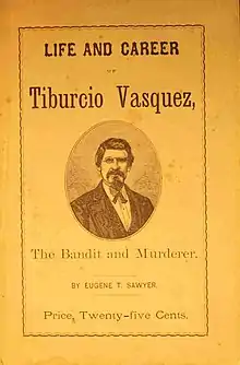- ↑ Sawyer, Eugene T. (1875). Life and Career of Tiburcio Vasquez: The Bandit and Murderer Containing a Full and Correct Account of His Offenses Against the Law, from Boyhood Up, His Confessions, Capture, Trial, and Execution. Bacon & Company Book & Job Printers, San Francisco.