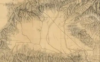 The grant, which was supposed to contain fourteen square leagues, was bounded on the north by Rancho San Francisco and the Santa Susana Mountains, on the west by the Simi Hills, on the east by Rancho Tujunga, and on the south by the Montañas de Portesuelo (Santa Monica Mountains). When the Rancho Ex-Mission San Fernando grant was patented in 1873, it was surveyed at nearly twenty six square leagues, the single largest land grant in California.[13] It amounted to "nearly 120,000 acres, virtually all of the Valley save for the Encino and a few other ranchos,"[14]