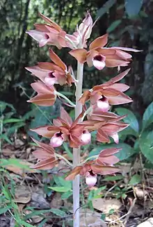 Eulophila zollingeri, commonly known as the carrion orchid[2] or 无叶美冠兰 (wu ye mei guan lan),[3] is a plant in the orchid family and is native to areas from tropical and subtropical Asia to Queensland. It is a leafless, brownish terrestrial orchid with up to forty reddish brown, sharply scented flowers with a dark red and yellow labellum. It grows in decaying wood in and near rainforests.
