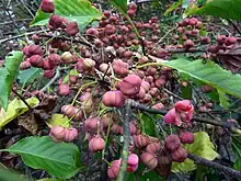 Like some other spindles, this plant is cultivated as an ornamental for its fall foliage, which can be many bright shades of red, pink, and yellow. The fruits and large seeds are also considered attractive. Cultivars include 'Coral Charm', which has light pink fruit capsules containing seeds with red arils, and 'Red Elf', a shrubbier breed with dark pink fruits and seeds with orange-red arils.[8]