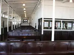 Two standard-gauge railway tracks, on which the railroad cars were transported, were installed the length of the main deck through the center of the ship. Passenger accommodations were located on either side, fore and aft of the paddleboxes, with one side of the ship reserved for female passengers and the other for males. The female side included a moveable partition around the paddlebox that allowed passengers to move between cabins in privacy; this partition could be folded up to make room for railroad cars when required. The passenger decorations on each side differed, with the men's featuring grained panelling, and the women's, "parti colors, with gilt moldings and beadings".[5] Floors on the ladies' side featured velvet carpets, while oilcloths sufficed for the men. At each end of the passenger quarters were vestibules, fitted with doors to prevent drafts. Seats throughout were built of semi-circular strips of cedar and black walnut, separated by black walnut arms. The main deck also featured a bar—located near the engine—toilets and a restaurant. Joinery work throughout the vessel was by Robert Bragg.[5]