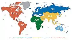 The European Judo Federation consists of 51 national Judo federations/associations, and is itself recognised by the International Judo Federation as one of five continental unions. The organisation of the administration of Judo is based on a pyramid system of regulations, with the IJF the world governing body, the EJU the European governing body, and national Judo associations the governing bodies at domestic level.[1][2]
