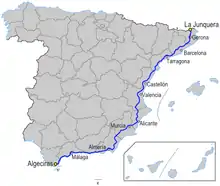 AP-7: La Jonquera - Girona - Rubí (E-9) - Rubí (Start of concurrency with E-90) - El Vendrell (End of concurrency with E-90) - Tarragona - Castelló de la Plana - València (E-901) - Alacant(E-903) - Crevillent