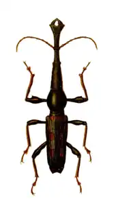 Eutrachelus temmincki is the largest species in the family Brentidae and has one of the longest snouts among beetles. These giant weevils can reach a length of 55–75 millimetres (2.2–3.0 in) in males (including snout), while females are smaller (about 65 mm.), with a narrower head and snout. Body is elongated, with a long snout and more or less developed jaws. The basic color is black with small orange to red spots on the elytra.