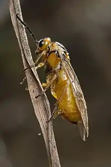Euura is a genus of sawflies of the family Tenthredinidae, subfamily Nematinae. Some of the larvae feed externally on plants and some form plant galls on willows (Salix species).[1] In the case of the gall-forming species, when the female lays her eggs she injects a stimulant and the gall starts to form before the eggs hatch. Most sawfly galls are hard and individual larva tend to inhabit the gall, feeding on the tissue and leave the gall to pupate in the soil.[2] Most of the species are monophages (i.e., specific to one species of willow) although the type species, Euura mucronata, is polyphagous feeding on over thirty species of willow.[3]