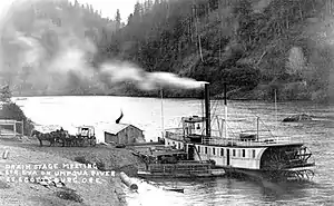 From 1876 to 1916, the Drain-Coos Bay stage line provided for travellers from Drain, Oregon to proceed by stage coach to Scottsburg, where they would meet a steamboat to proceed down the Umpqua river.[8] Eva and other steamboats on the river provided an important link in the line by providing riverine service between Scottsburg and Gardiner, Oregon.[6][9]