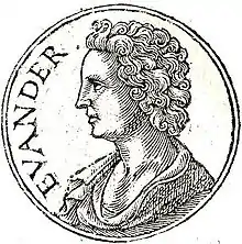 In Roman mythology, Evander (from Greek Εὔανδρος meaning "good man" or "strong man": an etymology used by poets to emphasize the hero's virtue)[1] was a culture hero from Arcadia, Greece, who was said to have brought the pantheon, laws, and alphabet of Greece to ancient Italy, where he founded the city of Pallantium on the future site of Palatine Hill, Rome, sixty years before the Trojan War. He instituted the festival of the Lupercalia. Evander was deified after his death and an altar was constructed to him on the Aventine Hill.