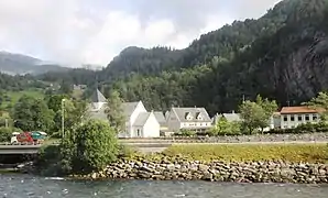 Evanger Church (Norwegian: Evanger kyrkje) is a parish church of the Church of Norway in Voss Municipality in Vestland county, Norway. It is located in the village of Evanger. It is the church for the Evanger og Bolstad parish which is part of the Hardanger og Voss prosti (deanery) in the Diocese of Bjørgvin. The white, wooden church was built in a long church design in 1851 using plans drawn up by the architect Hans Linstow. The church seats about 250 people.[1][2]