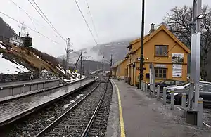 Evanger Station (Norwegian: Evanger stasjon) is a railway station located on the Bergensbanen railway line in the village of Evanger in Voss municipality, Vestland county, Norway. The station is served by twelve daily departures per direction by the Bergen Commuter Rail operated by Vy Tog. The station opened as part of Vossebanen in 1883.
