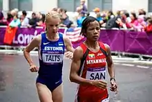 Evelin Talts (left) with Ni Lar San at the Women's marathon in London 2012.