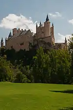 Her castle, which had been originally different and less grand in a concept art by Cornett Wood,[42] might have been inspired by Spain's Alcázar of Segovia[43][44][45] and the throne she is uses has a peacock motif to symbolise her extreme vanity.[46] The Queen is clad mostly in black and other "negative" dark colors, providing a contrast to Snow White's bright colorful wardrobe,[47] and has "shiny black hair" under her hood.[9] Her royal costume was painted with specially developed paints made to look like satin for her collar and like velvet for her robe.[40] The Queen's music tracks were created with low celio notes, basses, and bassoons; the scribblings in her book of spells were written in Italian.[48] The mysterious entity in her mirror was described as her familiar demon in a press book,[8] but this was never made explicit in the film or any of its adaptations.