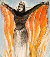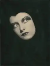 The Queen's appearance was inspired by the "ageless ice goddess"[23] character of Queen Ayesha ("She who must be obeyed") from the 1935 film She, played by Helen Gahagan.[24][25] The Queen, who was originally to be named Grimhilde[12] (but who is never actually named in the film[26]), was also modeled in part on Princess Kriemhild in the 1924 film Die Nibelungen.[27] The Queen's face may have been inspired by Joan Crawford[28][29] and also Greta Garbo, Marlene Dietrich and Gale Sondergaard.[30] Her costume and figure may have been inspired by a column statue at the Naumburg Cathedral depicting Uta von Ballenstedt, the wife of Eckard II, Margrave of Meissen who was widely regarded as the most beautiful woman of Medieval Germany.[31][32][29] Also noted was her resemblance to two 1930s American movie stars from Europe, Greta Garbo and Marlene Dietrich.[33] The Queen and Snow White were refined by Grim Natwick and Norm Ferguson, who would often override Walt Disney's instructions.[34] As in the case of other characters for the film, the Queen's appearance had to be approved by Albert Hurter before being finalised.[18] One pre-final version of the queen had her wear a looser hood and a different crown and the edge of her cape was fur trimmed, as it can be seen in Gustaf Tenggren's pictures.[35][36]