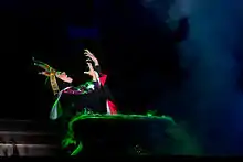 In the Disney Villains Mix and Mingle and Mickey's Boo-to-You Halloween Parade shows during Magic Kingdom's Mickey's Not-So-Scary Halloween Party, the Queen is one of the villains led by Maleficent that appear during the Cinderella Castle Forecourt Stage.[78][79] Susanne Blakeslee voiced the Queen at 2001's Share A Dream Come True Parade, where she could be seen transform herself into a hag.[80] The Evil Queen is one of the "favourite" villains included in Magic Kingdom Park's special pre-parade procession "It's Good to be Bad" a night before the annual Main Street Electrical Parade.[81] One event featured a giant interactive mirror and included the Queen and two other "Divas of Evil", Maleficent and Cruella de Vil.[82] She also prominently appears at Villains Unleashed party,[83][84] a separately ticketed event at Disney's Hollywood Studios that was introduced in 2014.[85]
