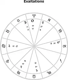 Since in Hellenistic astrology aspects were generally recognised from sign to sign, it is uncertain whether the distance of a planet from the exact degree of exaltation had much significance.[10] However, the degree itself was used by ancient astrologers; for example, the exact degree of exaltation of each of the luminaries (the Sun and Moon) was used in the formula for the Hellenistic Lot of Exaltation.