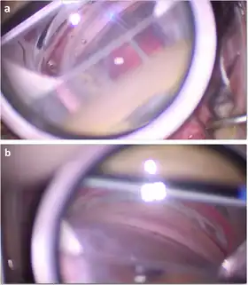 ![]() Gonioscopic view of excimer laser trabeculostomy. View of the probe contacting the trabecular meshwork (a) and the subsequent trabeculostomy openings with bubble formation (b). | |