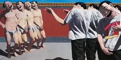 The artist, Yue, denies that his paintings are a veiled criticism of his government or of Chinese society, and he does not believe his work will bring him trouble.[2]