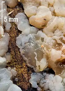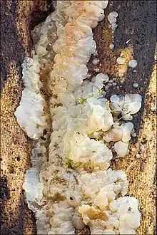 Exidia thuretiana forms shallowly pulvinate (cushion-shaped), gelatinous fruit bodies that individually measure 0.2 to 1 cm (0.1 to 0.4 in) in diameter.[6] The fruit bodies quickly coalesce, often running along the underside of branches and extending up to 10 cm (4 in) or more. They typically appear undulating or pleated and are whitish, occasionally with ochre or pinkish tints. The upper, spore-bearing surface (hymenium) is smooth and opaque, but is frequently furrowed and folded. It can have a pruinose (powder-like) coating. With age, the hymenium becomes a thin, horny, yellowish film.[7] The spore print is white.[8] The fungus does not have any distinct taste or odor; it is inedible.[6]