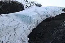 Exit Glacier is a glacier derived from the Harding Icefield in the Kenai Mountains of Alaska[1] and one of Kenai Fjords National Park's major attractions. It is one of the most accessible valley glaciers in Alaska and is a visible indicator of glacial recession due to climate change.[2][3] Exit Glacier retreated approximately 187 feet (57 m) from 2013 to 2014 and park scientists continue to monitor and record the glacier's accelerating recession.[4]