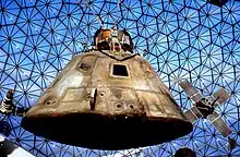 - United States of America Pavilion - designed by Buckminster Fuller, the pavilion was the third most popular, with over 9 million visits. The building was distinguished by its large 20-story geodesic dome with an acrylic skin (which would catch fire and melt away in 1976). The Expo 67 minirail train passed through the building. Designed by Cambridge Seven Associates, the six levels of exhibits, connected by escalators, were based on the theme of: "Creative America - the positive use of creative energy". The exhibits included everything from American Folk Art and Elvis Presley's guitar to NASA’s Apollo Command Module and Lunar Excursion Module. But not everyone liked the pavilion, including US President Lyndon B. Johnson, who (after a brief visit) was alleged to have said "the homosexuals have had carte blanche!" in reference to the design and content of the displays. After Expo 67, the geodesic dome was repurposed to house the Biosphère.
