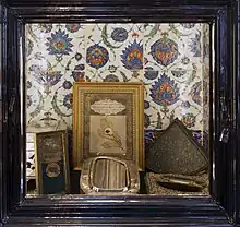 The wall of the mausoleum facing the portico is covered with panels of Iznik tiles dating from different periods and brought together during the reconstruction of the mosque in 1798–1799.[22] The walls of the mausoleum's vestibule are also covered in Iznik tiles, many of them showing the characteristic sealing-wax red glaze known as Armenian bole and dating from around 1580, a highpoint for İznik tile design.[22] Similar tiles in the Victoria and Albert Museum in London may once have covered the walls of the since demolished entrance hall (camekân) to the baths.[23][24][lower-alpha 5] The British Museum also has a panel of three navy and turquoise Iznik tiles, dating from around 1550, that are similar to some of those decorating the outside wall of the shrine.[31][32] In 2022 a man with a hammer damaged the tiles on either side of the dua penceresi (prayer window) in the courtyard of the mosque, claiming that devil's horns were incorporated into their design.[33]