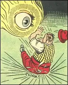 A boxer named "Tiny" is training to fight "Kid Wilson" but is not as tough as he used to be. Kid's coach, however, decides to cheat by using a gaseous sedative that will knock out his opponents. The Eye tells Tiny to stuff his nose with cotton and to target Kid's nose in order to dislodge his cotton. Tiny does and beats Kid, becoming "the new world's heavyweight champion". After the match, The Eye appears before the coach, scaring him and causing him to fall, breaking the vial and knocking out everyone in the locker room. The boxing commission discovers what they did and fire them.[14]