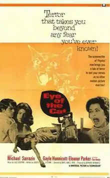 Eye of the Cat is a 1969 American horror film directed by David Lowell Rich and starring Michael Sarrazin, Gayle Hunnicutt, and Eleanor Parker. The screenplay is by Joseph Stefano, best known as the co-creator of the tv-series The Outer Limits and the author of the script for Alfred Hitchcock's Psycho.[2]