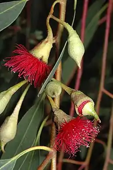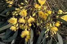 Flower buds and yellow flowers of Eucalyptus petiolaris