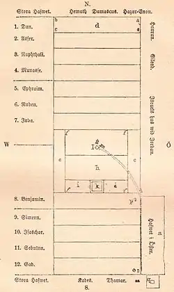 The last section of the book records the vision of the "structure like a city" seen by Ezekiel in Ezekiel 40:2.[20] These verses apparently are added from a different source, focusing the city gates on each of the four sides, and each gate is named after a certain tribe (cf. Revelation 21:12f) to complete 'a picture of perfect order and harmony'.[19] This new city is different from the Jerusalem in history, because the gates of the post-exilic Jerusalem in Nehemiah time were carefully noted, yet none was named after the tribes (cf. Nehemiah 3), although in the pre-exilic period there were a Benjamin gate and an Ephraim gate (Jeremiah 37:13; 2 Kings 14:13), but both were on the north side, not the east side, of the city.[20] Also, in the new city, Levi stands as one of the twelve tribes with its own gate, whereas Ephraim and Manasseh are represented by a single "Joseph" gate.[20] The order of gate naming seems to have its own logic, with the children of Leah on the north (Judah, Levi and Ruben) and south sides (Simeon, Issachar and Zebulun), the children of Rachel on the east side (Joseph and Benjamin, together with Dan, the eldest son of Bilhah, Rachel's handmaid) and the remaining children of the concubines (Gad, Asher and Naphtali) grouped together on the west.[20] The arrangement recalls the order of tribal camps surrounding the tabernacle, three on each of the four sides (Numbers 2), that brings the clear idea of "diverse but united people organized around a sacred point of reference," that is "the divine presence in its midst".[21]