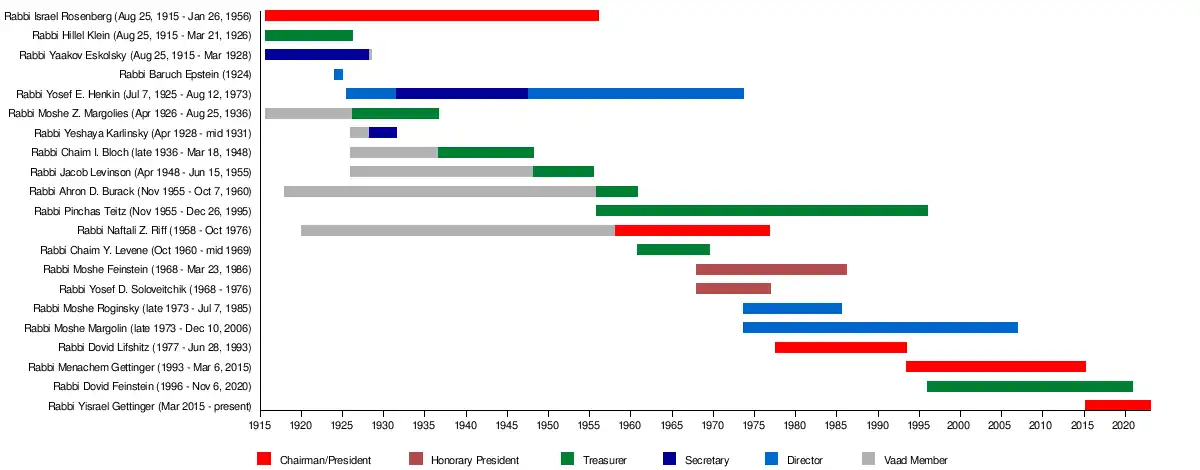 The founding leadership of Ezras Torah was composed of Rabbi Israel Rosenberg, Rabbi Dr. Philip Klein (aka Hillel HaKohen) and Rabbi Yaakov Eskolsky. Rabbi Rosenberg was president until his passing in 1956. Rabbi Klein was treasurer until his passing in 1926. Rabbi Eskolsky was secretary until 1928.