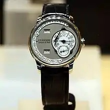 F. P. Journe, legally Montres Journe SA, is a Swiss-French[1] high-end watch Manufacture d'horlogerie founded in 1999 by François-Paul Journe. The only three-time winner of the Aiguille d'Or grand prize from the Fondation du Grand Prix d'Horlogerie de Genève,[2] Journe focuses on complex precision chronometers[3] with a production of around 800 watches per year.[4] 20% of the company was acquired by Chanel in 2018 for an undisclosed amount.[5]