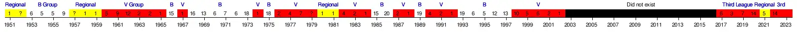 | Green marks a season followed by promotion, red a season followed by relegation. | |||||||||||