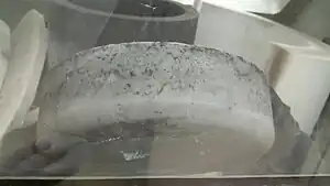FLiNaK in solid form, located inside of a glove box. Note: FLiNaK is almost pure white when crystallized, the black specks and waves in this image are likely from graphite or SiC from the crucible used to melt the salt.