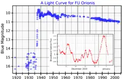 The blue band light curve for FU Orionis, adapted from Clarke et al. (2005).[1] The inset plot, adapted from Siwak, et al. (2013),[2] illustrates the short timescale variability.
