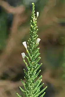 Fabiana imbricata, vernacular names pichi or false heath, is a species of flowering plant in the family Solanaceae, native to dry upland slopes in the foothills of the southern Andes of Chile and Argentina. Growing to 2.5 m (8 ft 2 in) tall and wide, it is a frost-hardy, heath-like evergreen mound-forming shrub. It has needle-like leaves and small white, tubular flowers in early summer.[1]