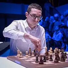In January, at the 2016 Tata Steel Chess Tournament, Caruana shared second (along with Ding Liren) with a score of 8 points out of 13 (+5-2=6), defeating Michael Adams, Wei Yi, Loek Van Wely, Pavel Eljanov, and Ding Liren, and losing to David Navara and Evgeny Tomashevsky. Had he defeated Tomashevsky, he would have at least tied for 1st place with Magnus Carlsen. Through this tournament, he gained 7 rating points and moved to #3 in the world. By March, as part of the qualification cycle for the World Chess Championship 2016, Caruana participated in the Candidates Tournament 2016, held in Moscow, Russia, from March 10–30 in the Central Telegraph (Центральный телеграф) Building. The lineup of the tournament included Viswanathan Anand, Hikaru Nakamura, Sergey Karjakin, Peter Svidler, Veselin Topalov, Anish Giri, and Levon Aronian. In the final round Caruana had Black against Sergey Karjakin in a winner-takes-all game. A complex position developed in which he made a mistake and was eventually defeated, making Karjakin the official challenger. Caruana eventually finished with a +1 score.[37] On April 25, Caruana became US Chess Champion for the first time, after defeating IM Akshat Chandra in the last round of the US Chess Championship. He finished the tournament with 8.5 points out of 11 games, and went undefeated. The field consisted of world top ten players Hikaru Nakamura and Wesley So; top 100 players Ray Robson, Sam Shankland, Gata Kamsky, and Alexander Onischuk; GMs Alexander Shabalov, Varuzhan Akobian, Jeffery Xiong and Aleksandr Lenderman; and IM Akshat Chandra.[38] In September, he played first board of the US Team at the 42nd Chess Olympiad. The US team won the gold medal, while Caruana won the bronze medal for first board.