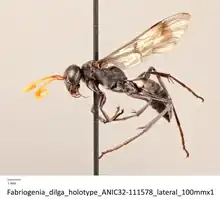 Body colour, wings and hair are the same as Fabriogenia canberra but the difference is in Fabriogenia dilga having a shorter antennae and shorter postnotum. Differences also exist in the shape of the clypeus and wing venation details.[2] Evans noted in his description that "dilga" is an Australian Aboriginal word from New South Wales that means "a stick of wood". He assumed the species nests in cavities in wood since his examples were reared from a trap-nest.[2]