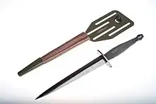The F-S fighting knife was made famous during World War II when issued to British Commandos, the Airborne Forces, the SAS and many other units, especially for the Normandy landings in June 1944. With its acutely tapered, sharply pointed blade, the F-S fighting knife is frequently described as a stiletto, a weapon optimised for thrusting,[2] although the F-S knife can be used to inflict slash cuts upon an opponent when its cutting edges are sharpened according to specification.[3] The Wilkinson Sword Company made the knife with minor pommel and grip design variations.