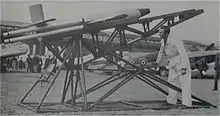The Stooge, on its launcher, was displayed at the Radlett Aerodrome in 1947.[10] Radlett, northwest of London, was the site of a major Handley Page factory and host of early meetings of what would become the Farnborough Airshow.