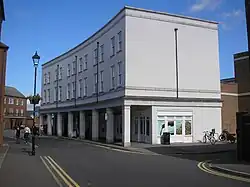 The architecture reflects traditional Aylesbury housing styles and incorporates Victorian elements such as lamp posts and railings. The centre of Fairford Leys is enclosed by a "city wall", which consists of three- and four-storey townhouses that form a continuous facade along the streets. The main entrance to the centre is marked by two towers that resemble medieval gate towers. This design feature was inspired by medieval city walls such as those in York, and was suggested by John Simpson, the master planner for Fairford Leys.