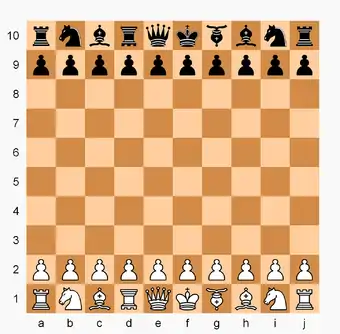 Decimal falcon–hunter chess starting setup. In the diagram, falcons are represented by inverted bishops; hunters by inverted rooks.