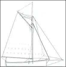 The mainsail is raised on a gaff.[2] The staysail may be rigged to a bumkin which extends its foot past the stem head. The jib is hauled out on a long bowsprit, which is often tightened downwards with the bobstay giving it a slight curve. A topsail is frequently employed, which is raised on a yard rather than a topmast.