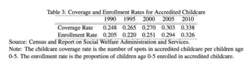 Childcare policies contain restrictions for children under six years old (coverage) and institutional credibility (accredited and non-accredited). “Accredited childcare centers must satisfy the criteria for capacity, area, the number of teachers per pupil, etc.”.[26] Subsidized childcare produce crowd funding with informal grandparental care, especially in a nuclear family oriented with the mother employed. Women's facilitation in the workforce is present but has not accommodated the difficulty of reduction in marriage, childbirth, and low capital.[25]