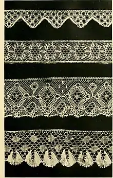 - ↑ Palliser, Bury, Mrs (1984). History of lace. Margaret Jourdain, Alice Dryden. New York: Dover Publications. ISBN 0-486-24742-2. OCLC 10697297.